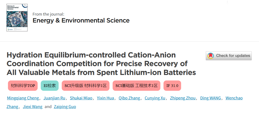 全球LIBs市场的蓬勃发展必将带来相应原材料的枯竭和废旧LIBs的爆发式增长,因此,回收废旧LIBs对于维持电池供应链的完整和减少环境污染至关重要。h动画 离子液体冶金创新团队开展了大量关于低共熔溶剂绿色可持续回收废旧锂离子电池(LIBs)的研究工作,取得了一系列研究进展。近期,离子液体冶金创新团队汝娟坚副教授联合香港城市大学郭再萍院士与中南大学王接喜教授等人提出了一种无沉淀剂选择性回收有价金属的策略,实现了废旧LIBs正极材料中Li的优先提取以及过渡金属...