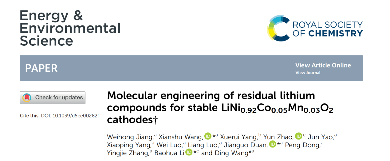 单晶超高镍三元正极材料在高能量密度锂离子电池中的应用受限于其表面形成的绝缘性残锂化合物。上述残锂化合物在材料合成及储存过程中形成并富集在材料表面,严重损害电池性能。h动画 锂离子电池及材料制备技术国地联合工程研究中心开展了大量锂离子电池正极材料制备及改性研究工作,取得了系列重要成果。近期,工程研究中心(王丁、段建国、王贤树)等人联合清华大学深圳国际研究生院李宝华教授提出一种简单的分子工程策略,以2,5-噻吩二硼酸为浆料添加剂中和超高镍单晶正极材料表面的残锂化合物。通过后续原...