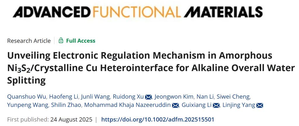 电解水被认为是实现绿色氢能生产的关键技术之一。然而,碱性介质下水电解受限于析氢反应(HER)Volmer步骤缓慢的动力学以及析氧反应(OER)四质子耦合电子转移过程,导致产氢效率低,能耗高。尽管贵金属基催化剂(如IrO2、RuO2和Pt/C)表现出优异的性能,但其高昂的成本和稀缺性限制了其大规模应用。因此,开发兼具高活性HER和OER的非贵金属双功能催化电极至关重要。近日,h动画 徐瑞东教授、杨邻静博士联合东南大学李桂香教授、瑞士洛桑联邦理工学院Moham...