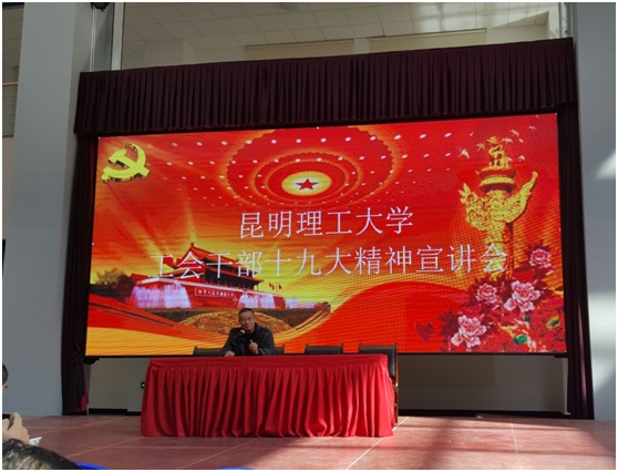 2017年12月26日下午校工会在工会教职工之家校工会召开了2017年工会干部培训暨表彰大会。首先请党校领导进行了十九大精神宣讲。并请云南省总工会财务部黄越红部长作工会财务管理专题培训。最后是表彰大会:1.表彰获云南省师德标兵称号个人。2. 表彰云南省教育卫生科研工会论文获奖人员。3. 表彰2017年校级师德先进个人。4. 表彰2011-2016年工会工作先进个人及集体。5. 向获得第五批校级“模范职工小家”的基层工会授牌。