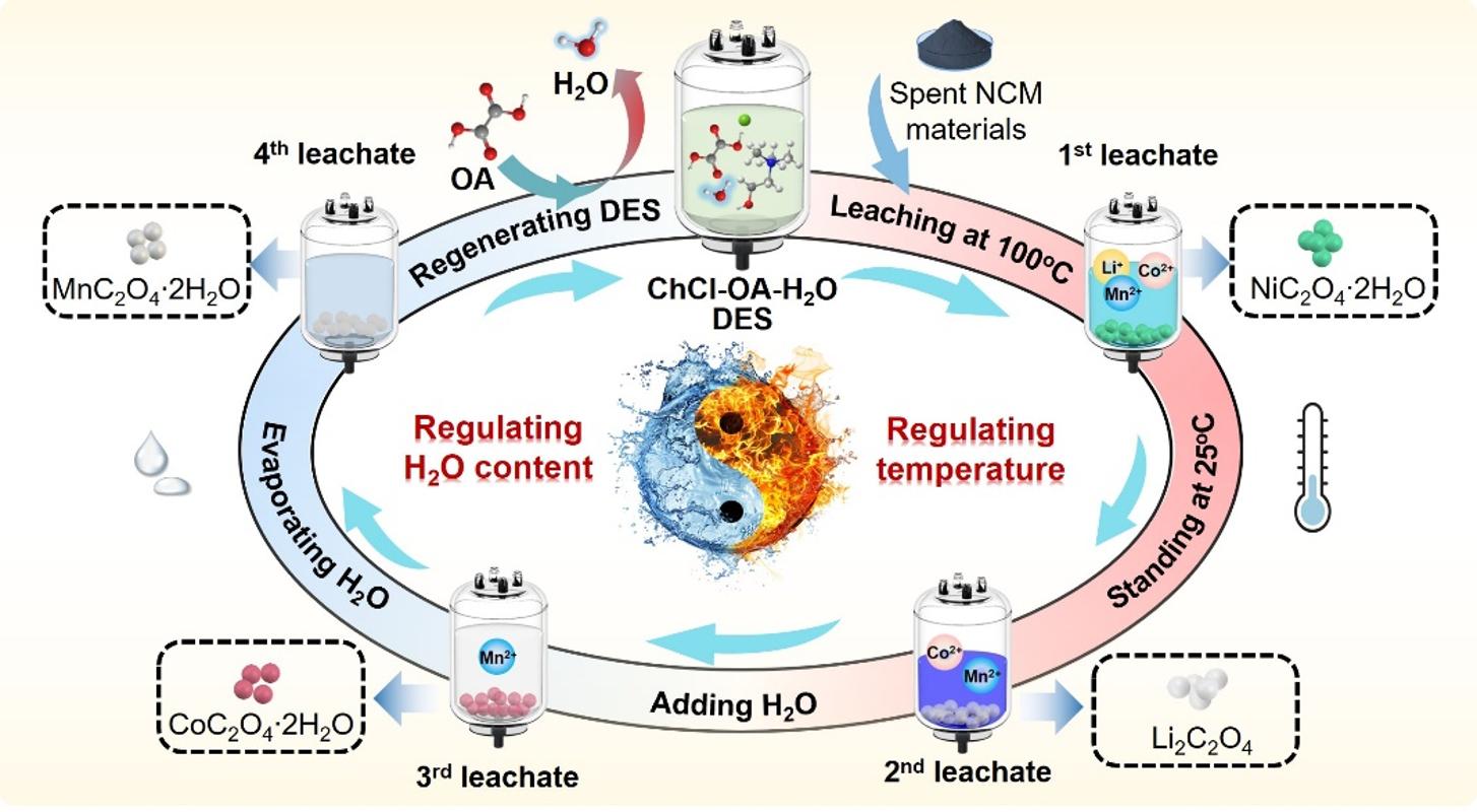 由于过渡金属Ni、Co和Mn的化学性质相似,在回收过程中易出现共沉淀,导致过渡金属间的分离困难。整个回收过程繁琐,需多次萃取与反萃取,不仅耗时,还依赖昂贵溶剂,导致流程复杂、废液量大,带来经济与环境双重负担。此外,Li的回收通常是在过渡金属分离之后,通过“加入沉淀剂→蒸发→结晶”的冗长模式才能实现。因此,开发一种高效、流程短、精准回收有价金属的策略至关重要。针对Li在水溶液中难以形成锂盐沉淀等问题,研究团队基于离子型低共熔溶剂(DESs)结构的可调性,并根据Li盐的沉降特性筛选出了原料价廉易得、制备简单、结构性质可调的氯化胆碱-草酸-水(ChCl-OA-H2O)DESs为浸出剂,实现了Li的优先提取(ACS Sustain. Chem. Eng. 2025, 13, 1719-1728. ESI高被引论文)。通过研究H2O含量对DES中阴离子和金属离子竞争配位机制的影响,揭示了Li的优先析出和Co的精准分离机理(eScience, 2024, 4, 100275. IF=42.9)。针对现有废旧LIBs正极材料中过渡金属选择性分离困难,Li回收常在流程末端通过蒸发结晶才能回收等突出问题,研究团队通过考察不同金属草酸盐(NiC2O4∙2H2O、Li2C2O4、CoC2O4∙2H2O和MnC2O4∙2H2O)在ChCl-OA-H2O DES中的溶解度,开发了一种无沉淀剂精准回收Ni、Li、Co和Mn的技术。该技术选用ChCl-OA-H2O DESs为浸出剂,全程无需引入额外化学试剂,而仅通过精确控制温度和H2O含量来调节金属离子的配位环境,即可快速可逆地调节Ni、Li、Co和Mn的配位形式以从废旧NCM正极材料中精准回收所有有价金属,回收率>94.0%,产品纯度>97.0%。整个回收路线短、简单,不需要添加额外化学试剂,并且对不同类型废旧LIBs正极材料(NCM111、NCM523、NCM622、NCM811、LCO、LMO和LFP)都具有良好的普适性和工业应用前景。