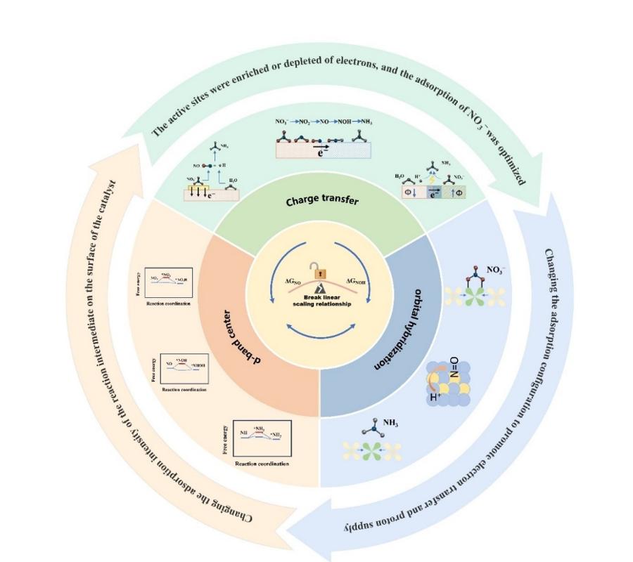 随着全球氮循环失衡与传统合成氨工业高能耗、高碳排放问题日益突出,开发绿色可持续的氨合成技术成为实现“碳中和”目标的重要方向。电催化硝酸盐还原(NO3⁻RR)合成氨成为极具潜力的替代路径,但面临选择性低、反应动力学缓慢、氢析出反应(HER)竞争剧烈等瓶颈。界面电子效应作为调控催化剂本征活性的关键策略,可通过优化活性位点电荷分布与中间体结合能,为突破上述瓶颈提供有效解决方案。然而目前缺乏界面电子效应与多步NO3⁻RR路径中的特定基元反应内在关联的总结。