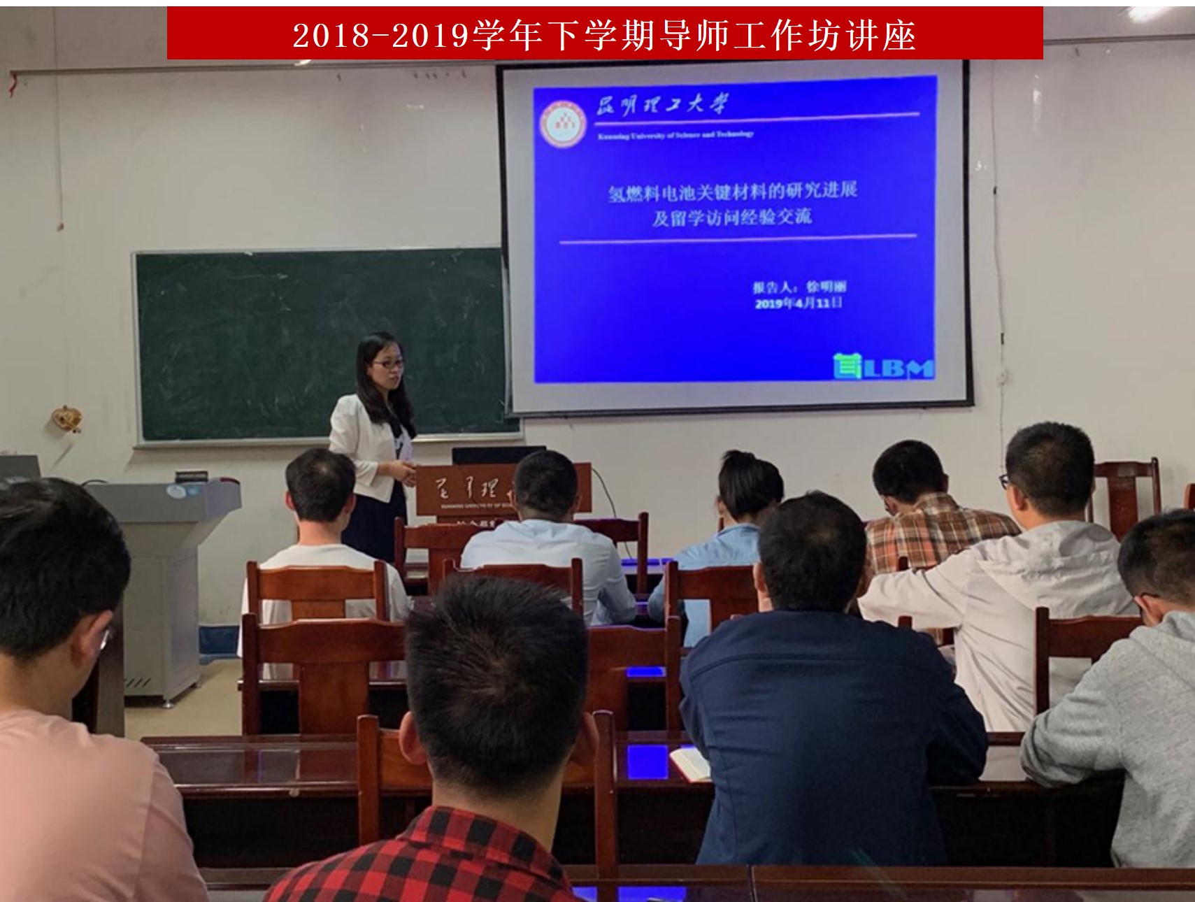 博士生导师徐明丽教授在莲华校区冶能楼407教室作了题为“氢燃料电池关键材料的研究进展及留学访问经验交流”的导师工作坊讲座,全校60余名师生聆听了讲座。