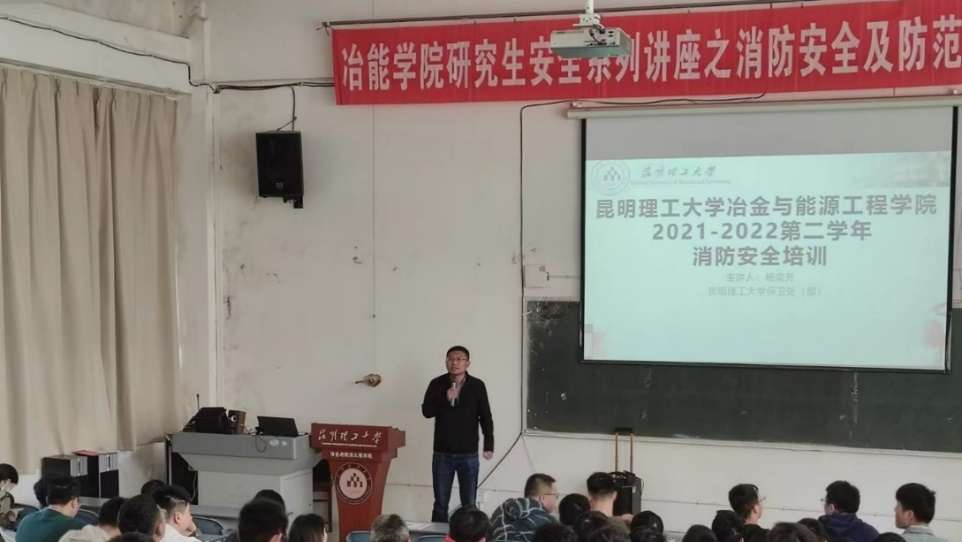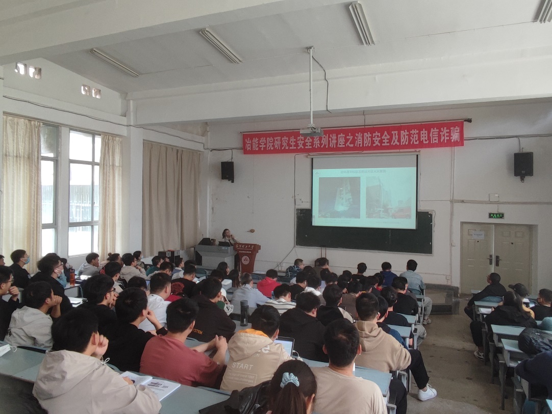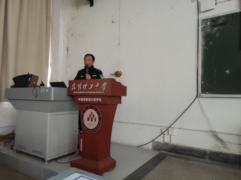 h动画 于5月24日上午在基础楼200教室举办研究生安全系列讲座,本次讲座的主题是消防安全及防范电信诈骗。讲座邀请h动画 保卫处消防科杨荣芳老师为大家进行消防安全培训,邀请昆明市公安局呈贡分局吴家营派出所副所长曲立军警官为大家主讲防范电信诈骗。