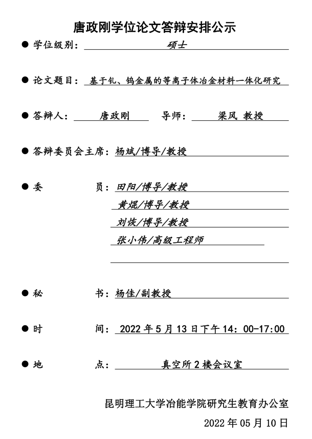 冶能学院硕士学位论文答辩安排公示——唐政刚——2022-05-13