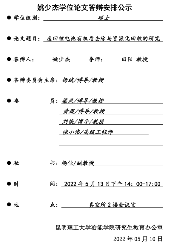 冶能学院硕士学位论文答辩安排公示——姚少杰——2022-05-13