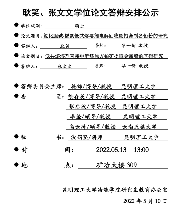 冶能学院硕士学位论文答辩安排公示——耿笑、张文文——2022-05-13