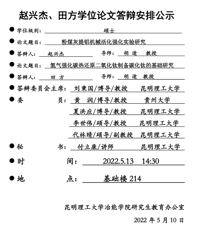 冶能学院硕士学位论文答辩公示——赵兴杰、田方——2022-05-13