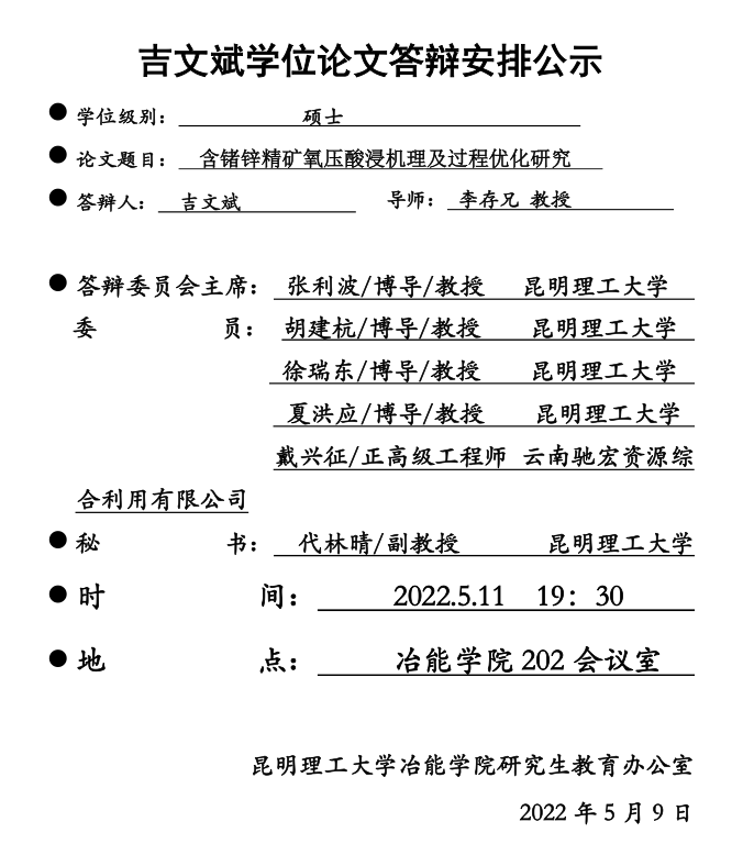 冶能学院硕士学位论文答辩安排公示——吉文斌——2022-05-11