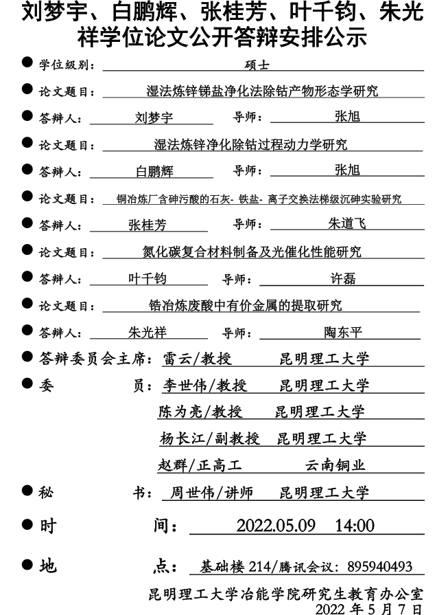 下一条:冶能学院硕士学位论文公开答辩安排公示——张禄、聂聪、贾高杰、李彦桦——2022-05-09