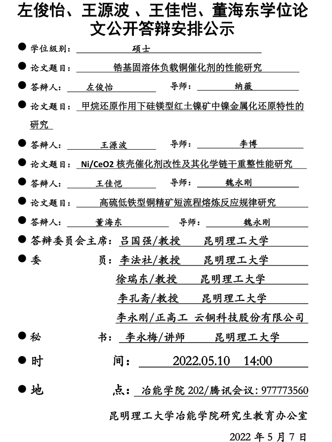 下一条:冶能学院硕士学位论文公开答辩安排公示——陈方军、梁思皓、王敬泉、来奎——2022-05-09