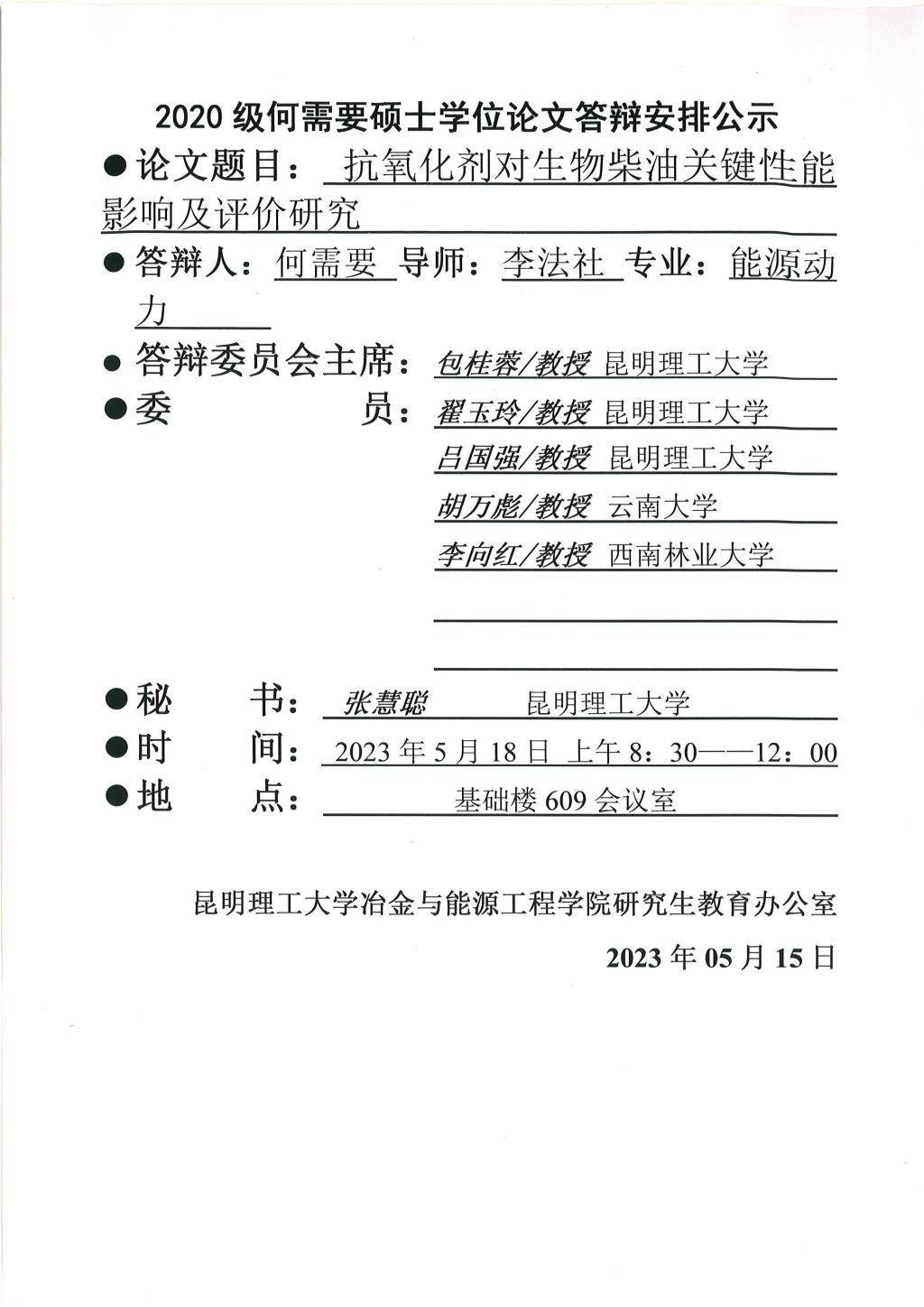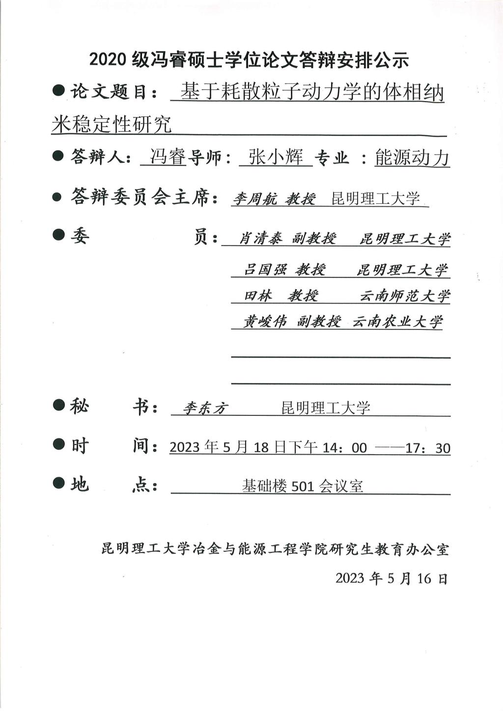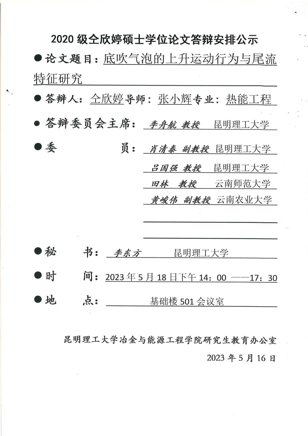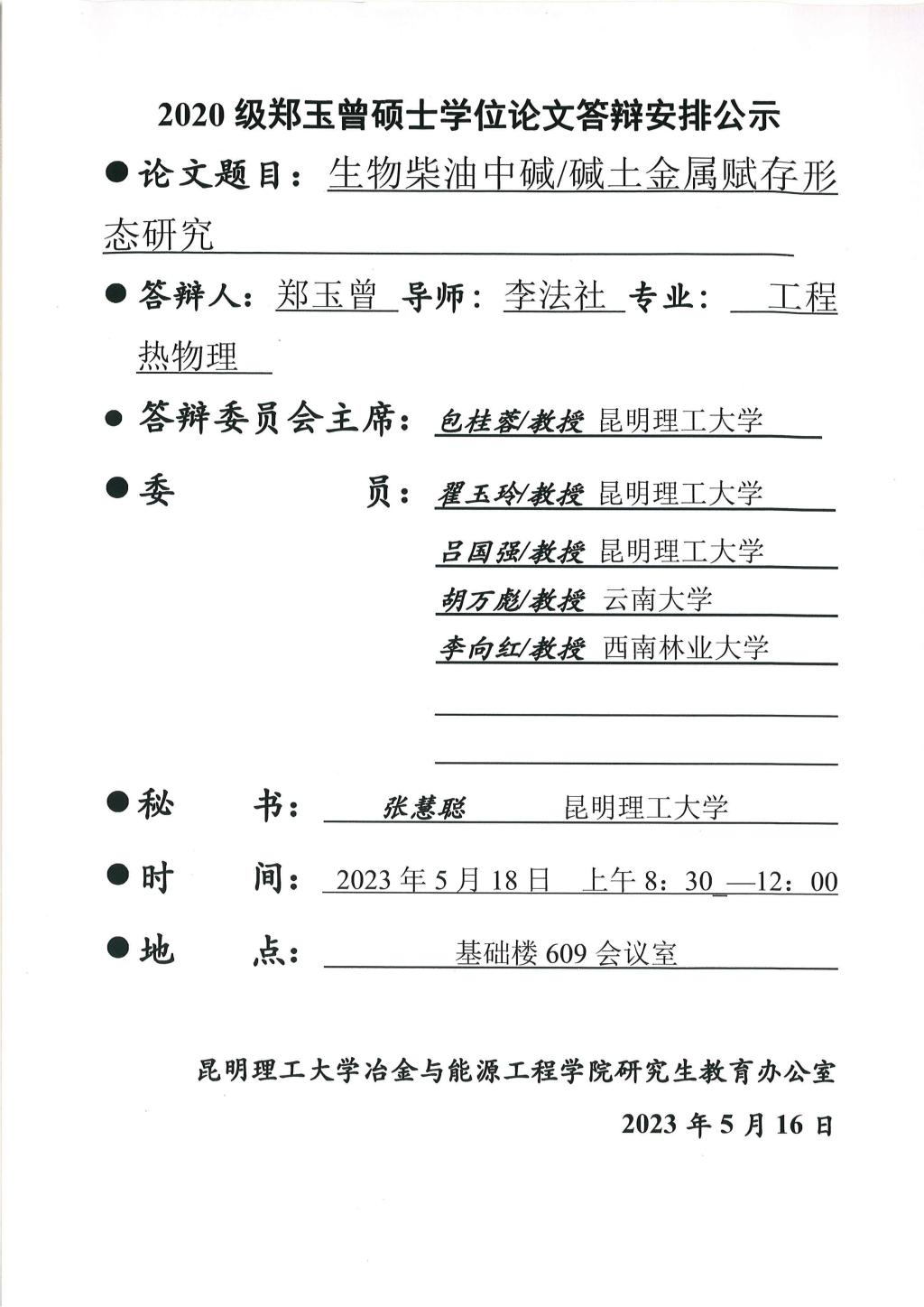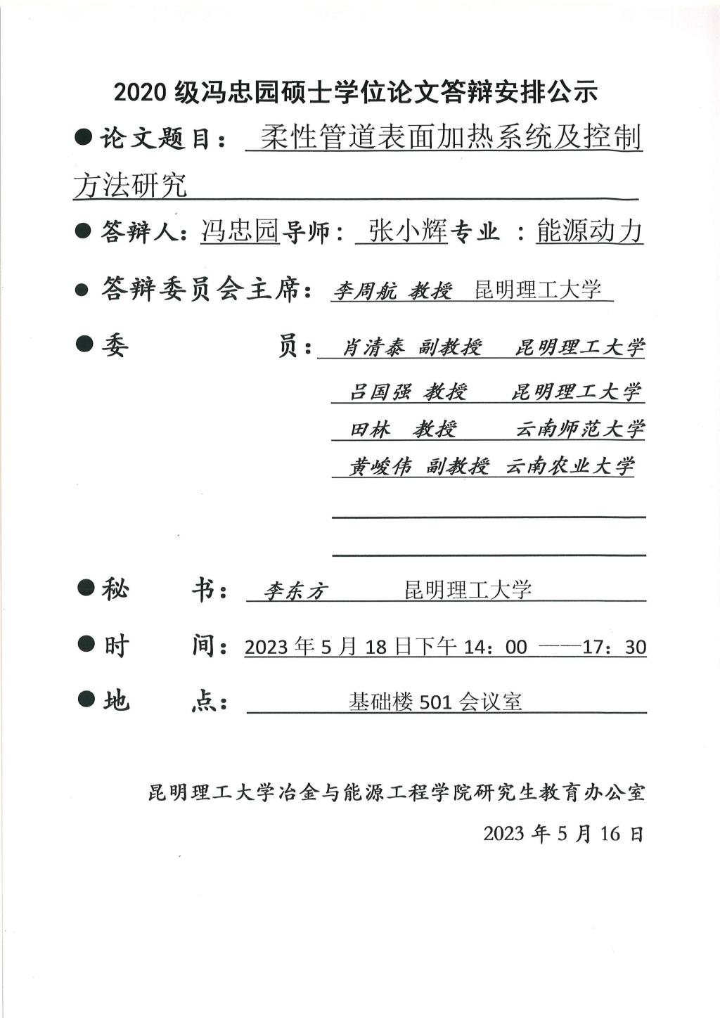 硕士学位论文答辩公示——何需要,郑玉曾,仝欣婷,冯睿,冯忠园——2023.05.18