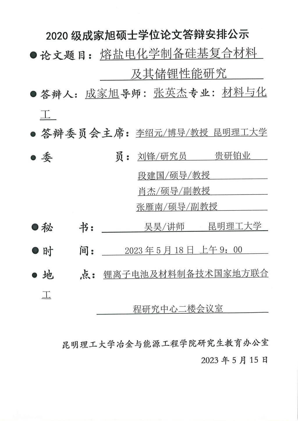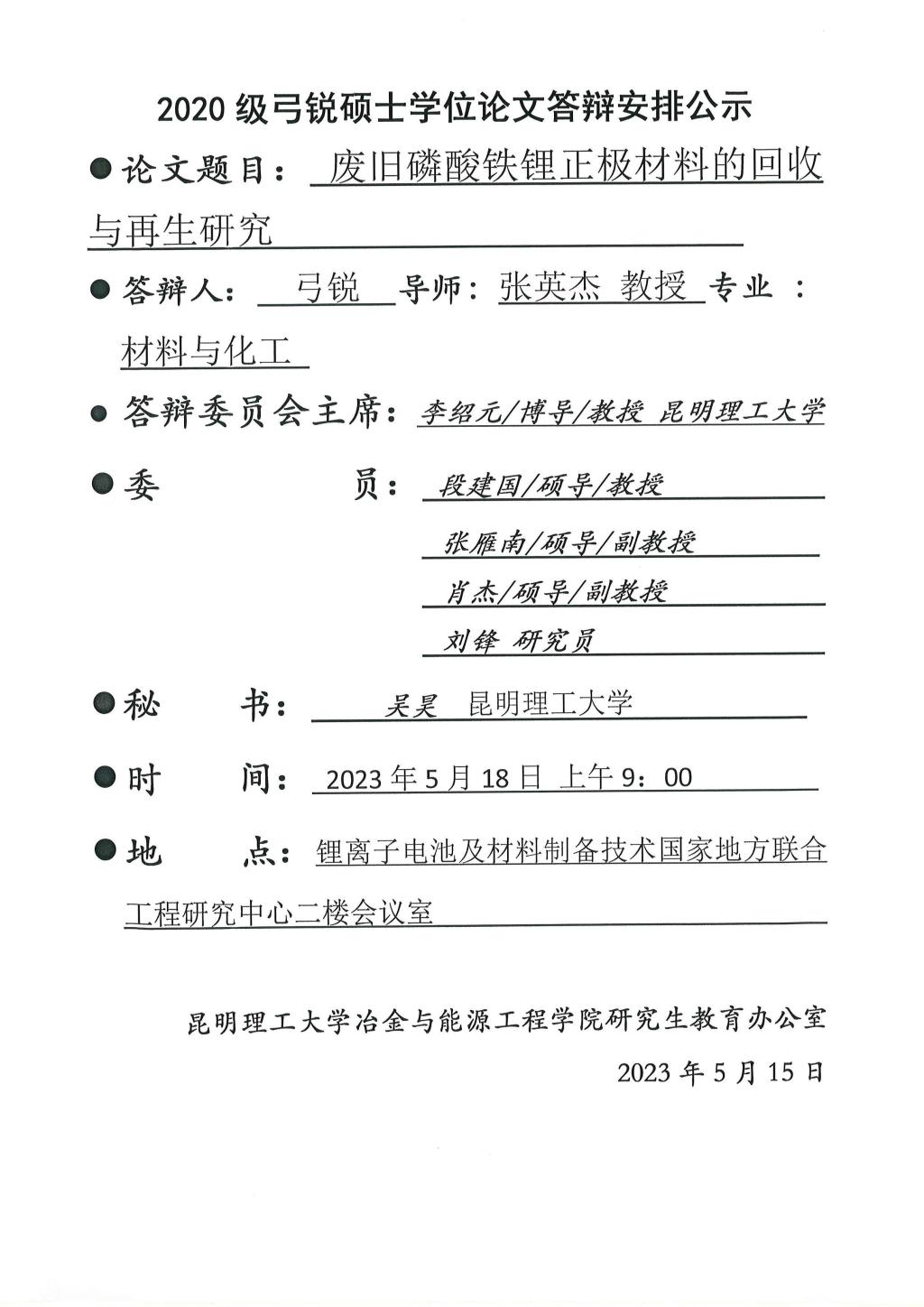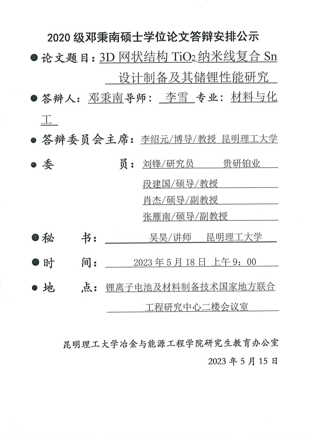 硕士学位论文答辩公示——邓秉南,成家旭,刘磊,弓锐,黄杰盟,杨泽龙,吴宏坤,刘露之——2023.05.18
