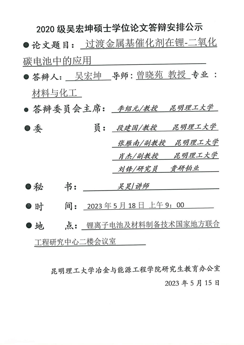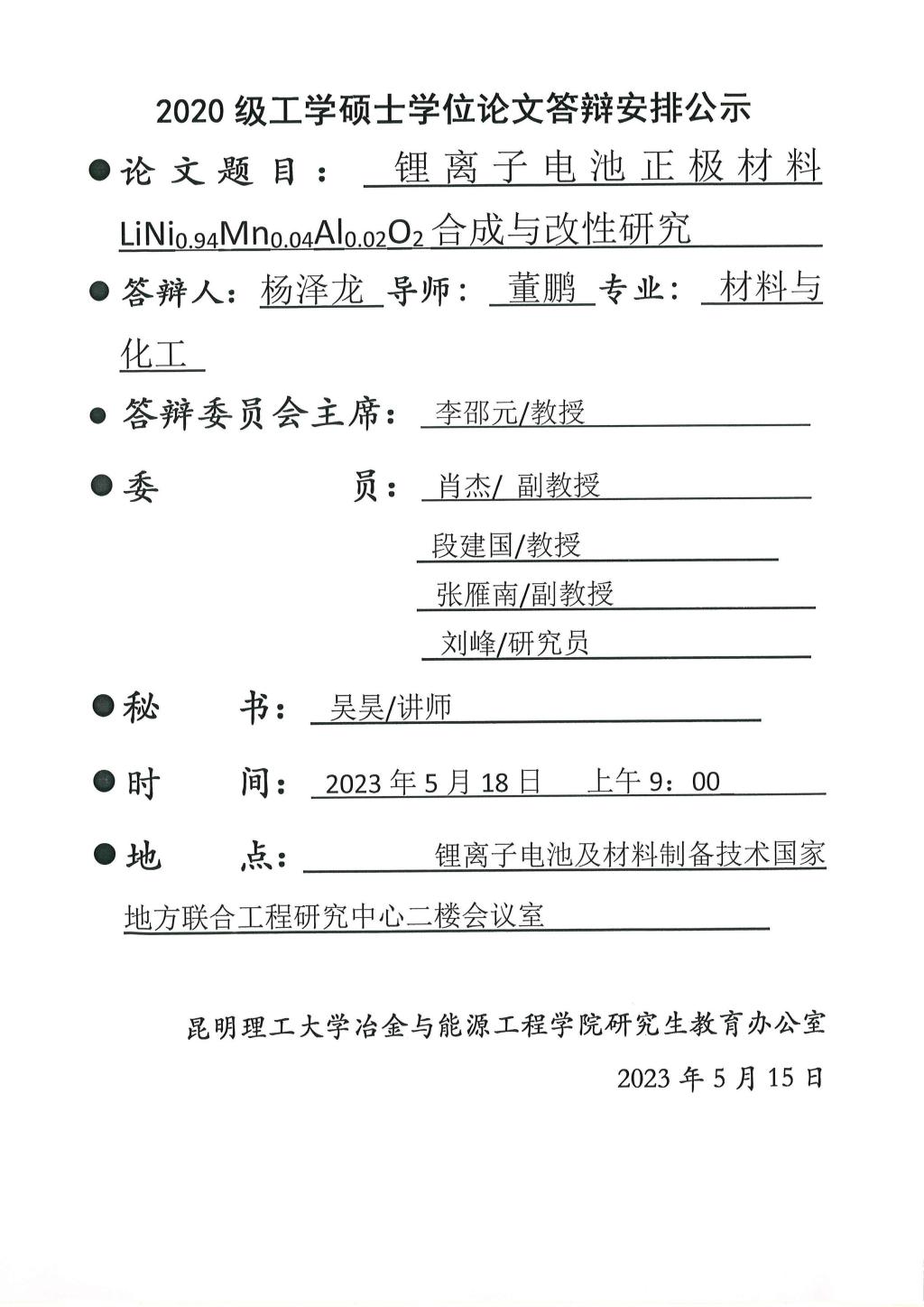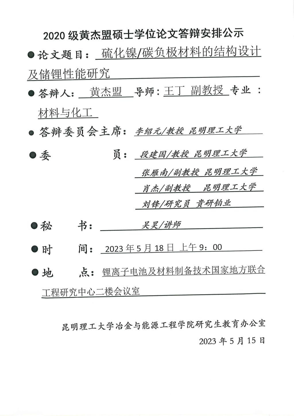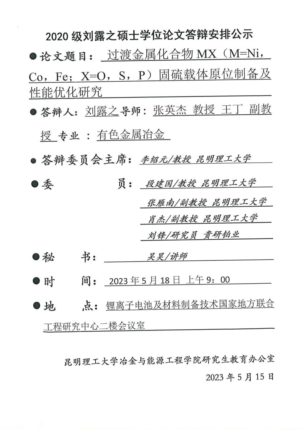 硕士学位论文答辩公示——邓秉南,成家旭,刘磊,弓锐,黄杰盟,杨泽龙,吴宏坤,刘露之——2023.05.18