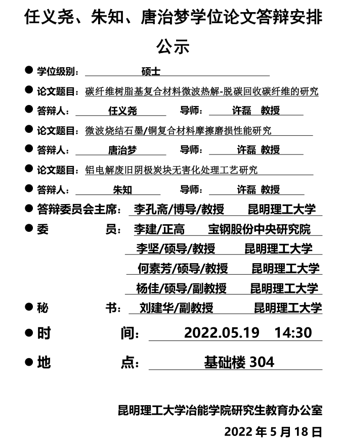 冶能学院硕士学位论文答辩安排公示——朱知、任义尧、唐治梦——2019-05-19