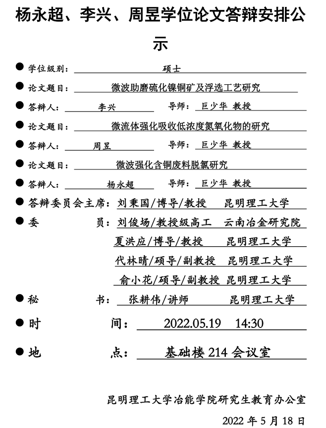 上一条:冶能学院硕士学位论文答辩安排公示——王凯徽——2022-05-20
