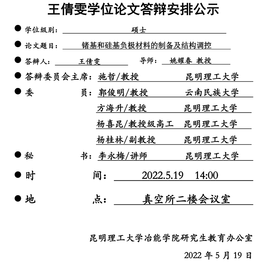 冶能学院硕士学位论文答辩安排公示——王倩雯——2022-05-19