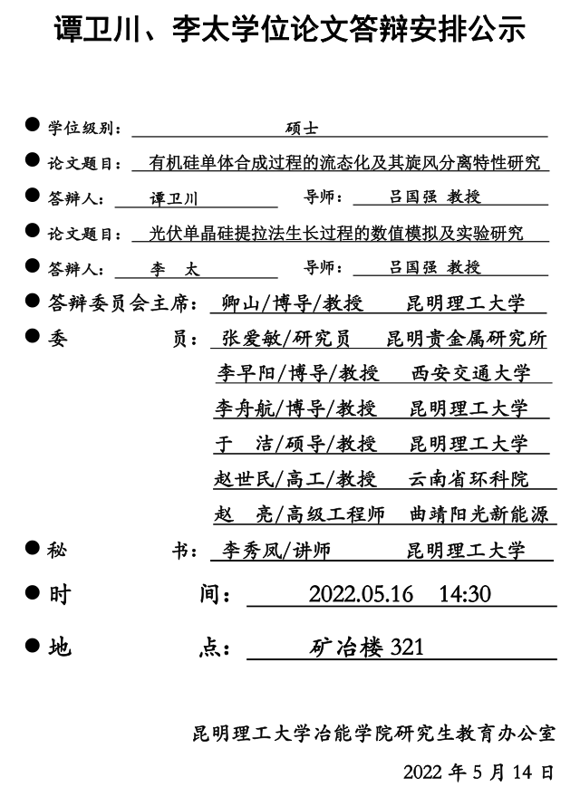 下一条:冶能学院硕士学位论文答辩安排公示——张迎、廖稷邦——2022-05-13