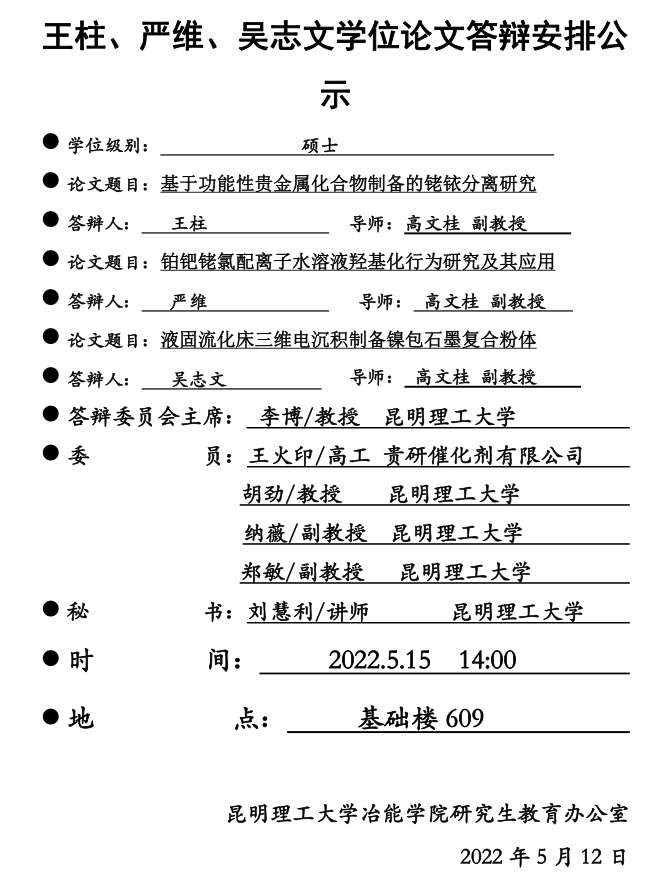 下一条:冶能学院硕士学位论文答辩安排公示——王淋川、肖文兵、刘宇轩、郭吉浩、蒲权文——2022-05-14