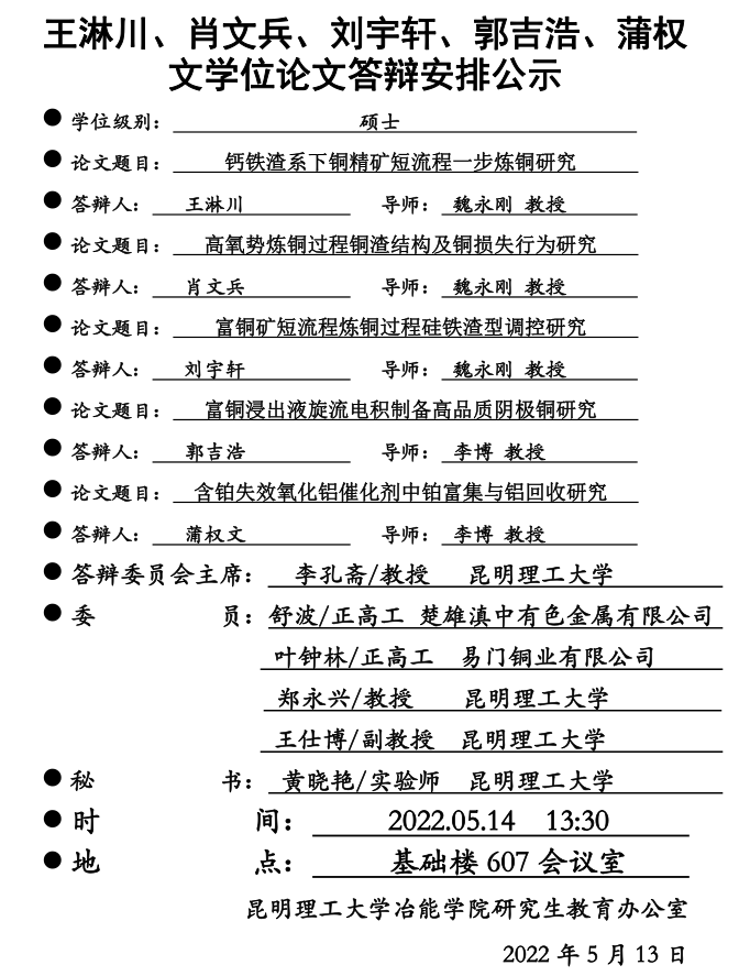 上一条:冶能学院硕士学位论文答辩安排公示——王柱、严维、吴志文——2022-05-15