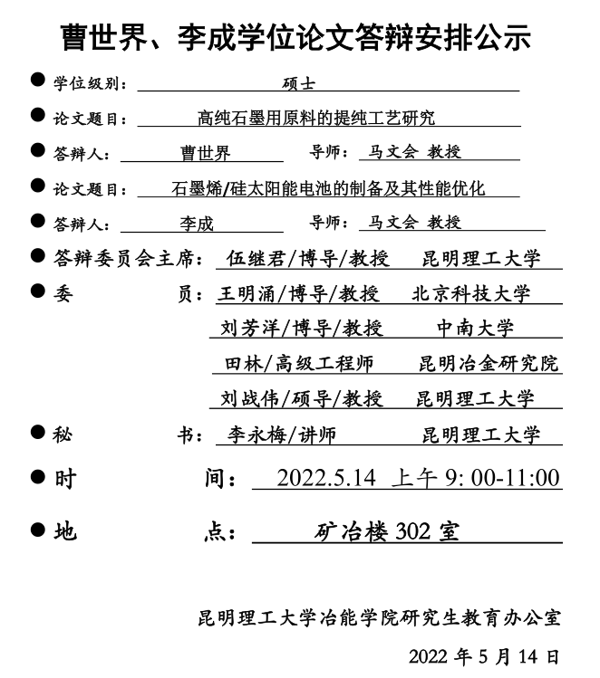 下一条:冶能学院硕士学位论文答辩安排公示——何乾、唐绮唯、周璐——2022-05-14