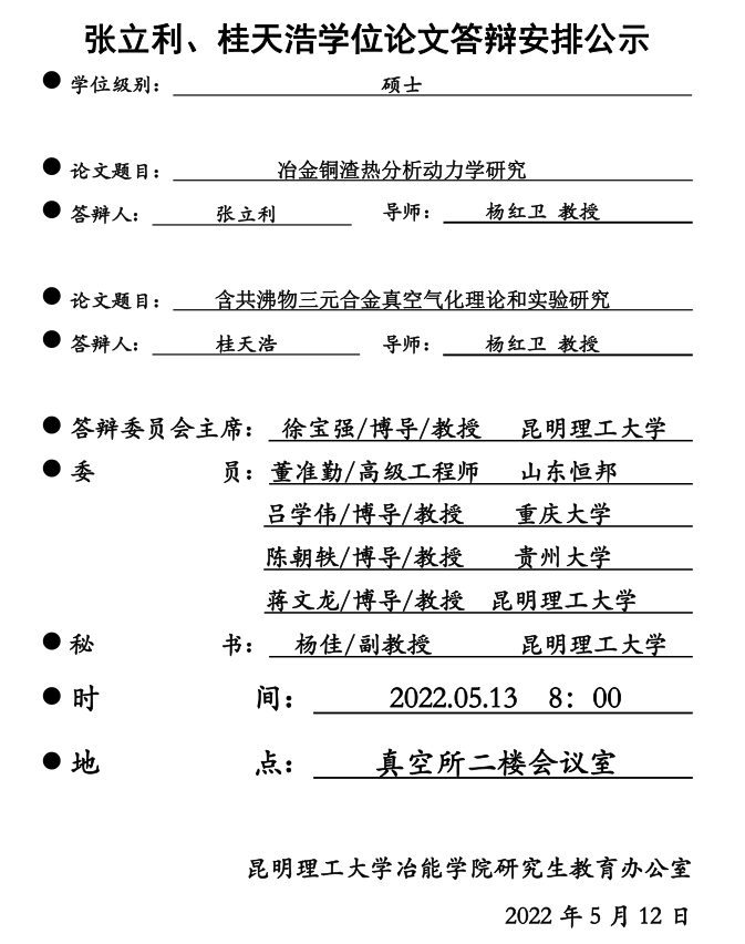 冶能学院硕士学位论文答辩安排公示——张立利、桂天浩——2022-05-13