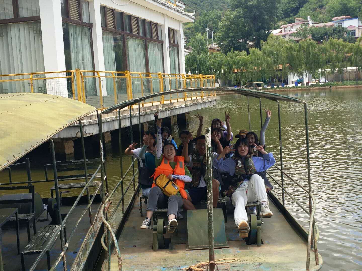 上午十点钟左右老师,还有各班的班长和团支书乘坐大巴车来到了昆明二龙湖拓展训练基地,在这里做的第一件事就是热身运动。拓展训练属于激烈性的运动,所以热身运动可以减少我们不必要的受伤。然后就是分为一、二组两个小队,给所在的小队创建属于本队的队名、队歌和口号和本队LOGO,以及团队风采展示。