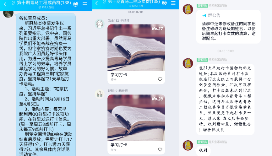 组织部举办“宅家抗疫,坚持早起”21天打卡活动,培养学员早起学习的好习惯。参加此次活动的为“青马工程”第三期全体学员。