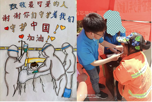 本次活动分别为社区服务活动、社区交流活动、推广抗疫精神三个类型。他们根据自己所在地区的条件或者是自己的兴趣爱好,可以选择参加活动的一个类型。在征集到的材料中,有的同学选择拿起自己手中的画笔描绘了一幅幅感动人心的绘画;有的同学在卡片上写下激励人心的话语,为我们奋战在一线的抗疫人员加油助威;当然,还有的同学选择走出家门,走向社区,为社区防疫服务贡献力量。他们拿起消毒喷雾主动给电梯按钮消毒,在小区门口测量体温为社区人民的安全提供保障。他们给清洁阿姨赠送口罩并指引他们正确佩戴。面对如此的一幕幕情景,同学们用真诚与勇敢温暖了我们的内心,给广大同学树立了良好榜样。