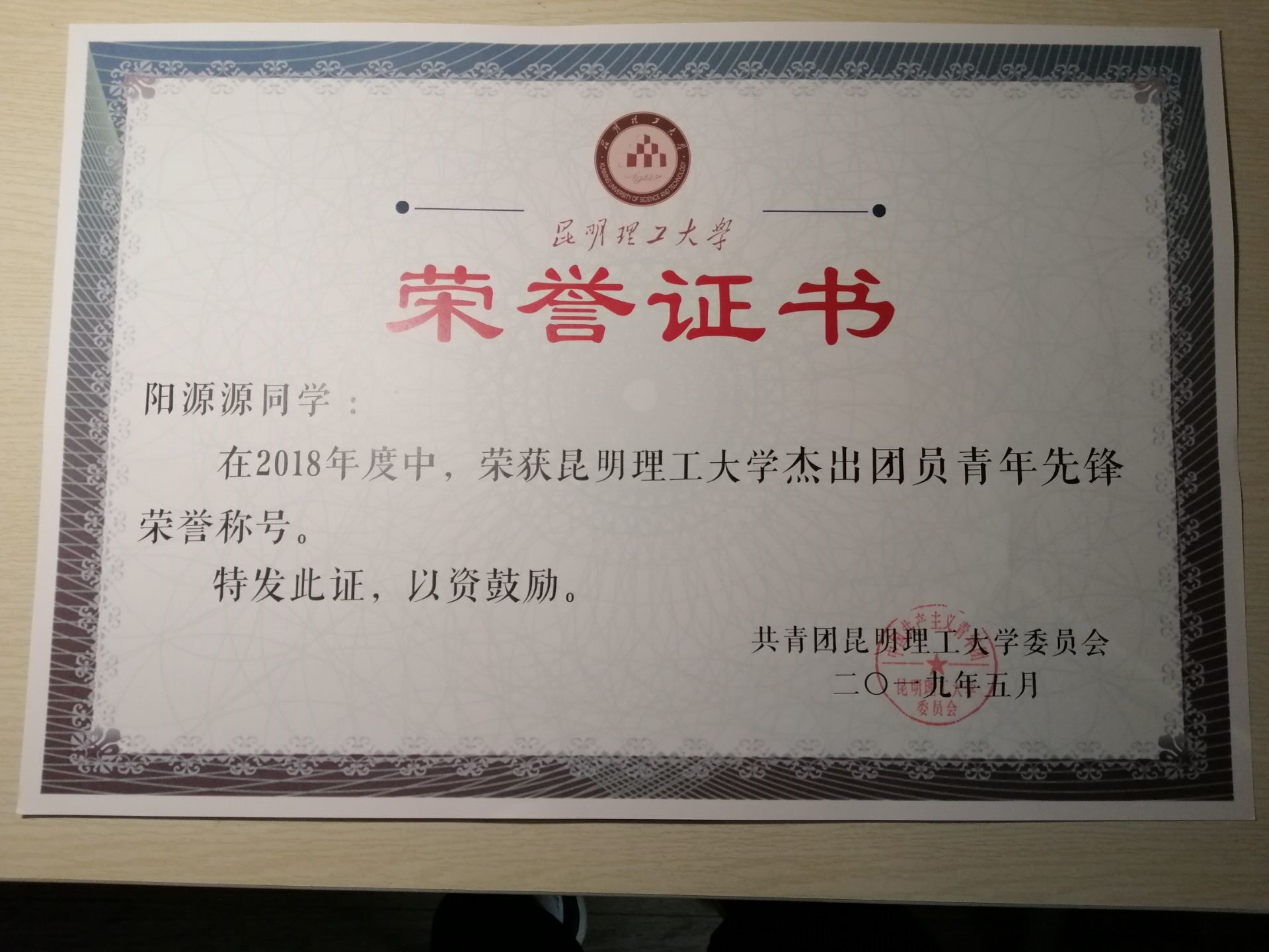 能科161班阳源源同学荣获“杰出团员青年先锋”