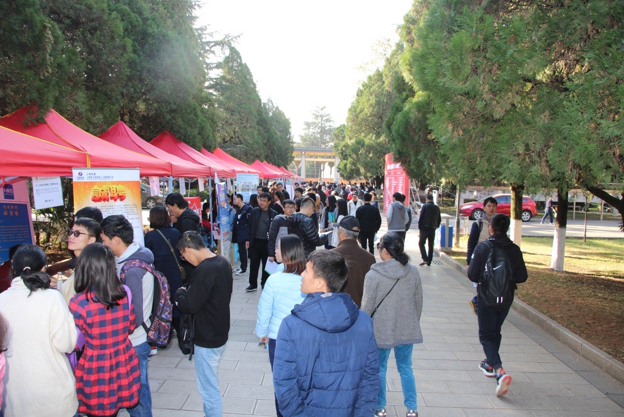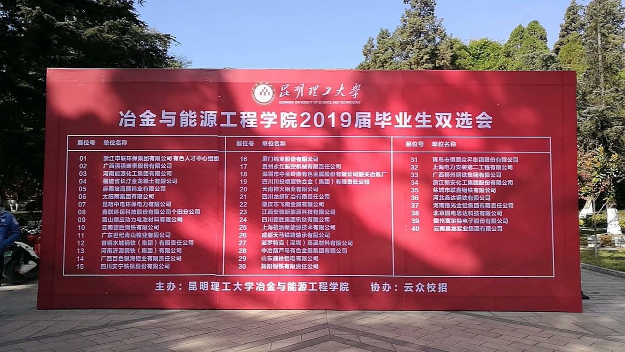 在莲华校区举办2019届毕业生双向选择洽谈会,这是冶能学院自主举办的第二届毕业生双选会。此次招聘会吸引到来自太阳雨集团有限公司、广东世纪青山镍业有限公司、昆明中电环保电力有限公司、云南神火铝业有限公司等40家全国各地的企业,共提供岗位500多个,覆盖到学院的全部专业,400余名本科及研究生毕业生参加了双选会。