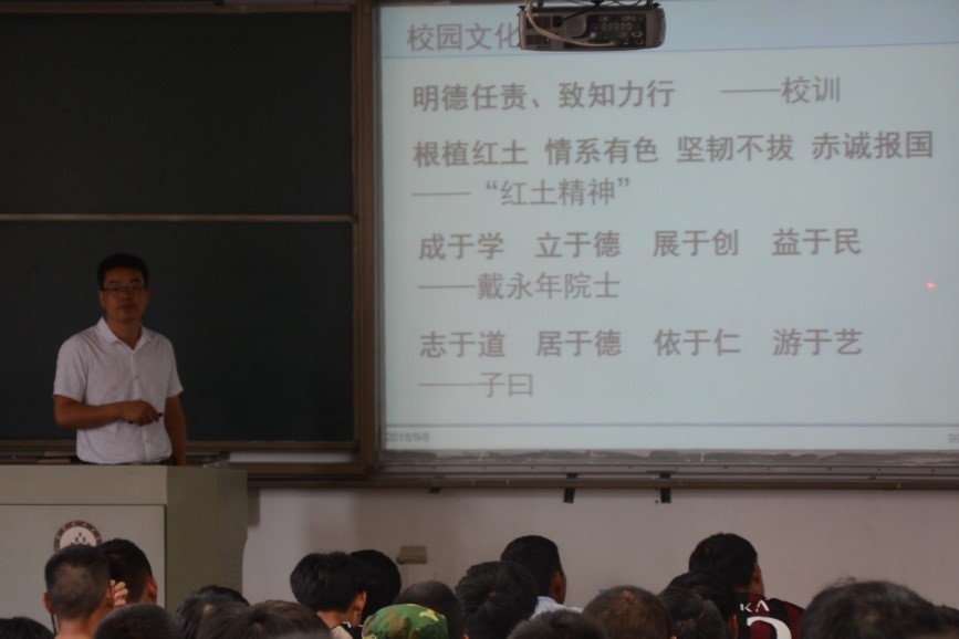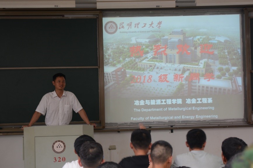 李兴彬老师先从冶金工程系的历史讲起,向新生们介绍了冶金学科发展中的一些重要历程。接着介绍了对冶能学院冶金学科做出巨大贡献的戴永年院士、李梦庚教授等多位奠基人,希望18级的新生能够将他们对冶金学科的精神传承下来,以他们为榜样树立严谨的科学态度。最后李老师着重介绍了节能减排大赛、科技创新大赛等大型学科竞赛,鼓励广大新生在本科阶段积极加入学院各个老师的课题小组和国家级、省部级实验研究平台。黄帮福老师从专业简介、培养计划、毕业方向等方面细致的向新生们介绍了他们即将面对的四年大学生活。黄老师说:“无论你是普通班,还是箐英班,都要好好学习,成绩好才是真实力。”并且强调要学好“物理化学”、“普通冶金流程”等几门重要的专业课程。在讲到毕业方向时黄老师将自己整理的往年毕业生去向统计数据展示给大家,告诫大家无论是选择升学还是就业,都应该提前做好准备,机会只会留给有准备的人。