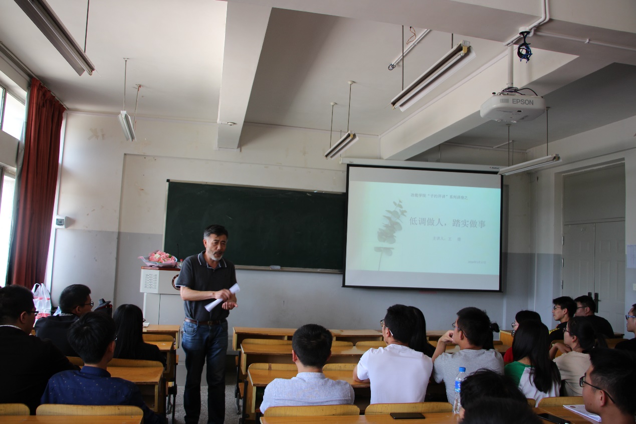 讲座开始,王煜老师从自己的中学求学时光开始讲起,以幽默风趣的语言向大家讲述了自己过去的经历,期间还穿插了自己游历二十几个国家丰富见识,期间教室里欢声笑语不断。王煜老师的讲座主要从五个方面出发,一、要立志,要立鸿鹄之志,强调立志和人生轨迹的关系;二、任何时候都不能放弃希望,通过对校友的经历出发,鼓励大家要有永不放弃的精神;三、本分做人,踏实做事,解释本分指的是把本职工作,分内的事做好,而本分的核心是“诚信”,提出了“只有你的言行举止不规范时才会被歧视,而不会因为的附属价值被歧视”;四、要有团队合作精神,提醒大家要有协调能力,也要有自己的一技之长;五、淡泊名利,宁静致远,建议大家保持良好积极地心态去迎接困难,并且在克服困难的历程中,有坚持到底的精神。