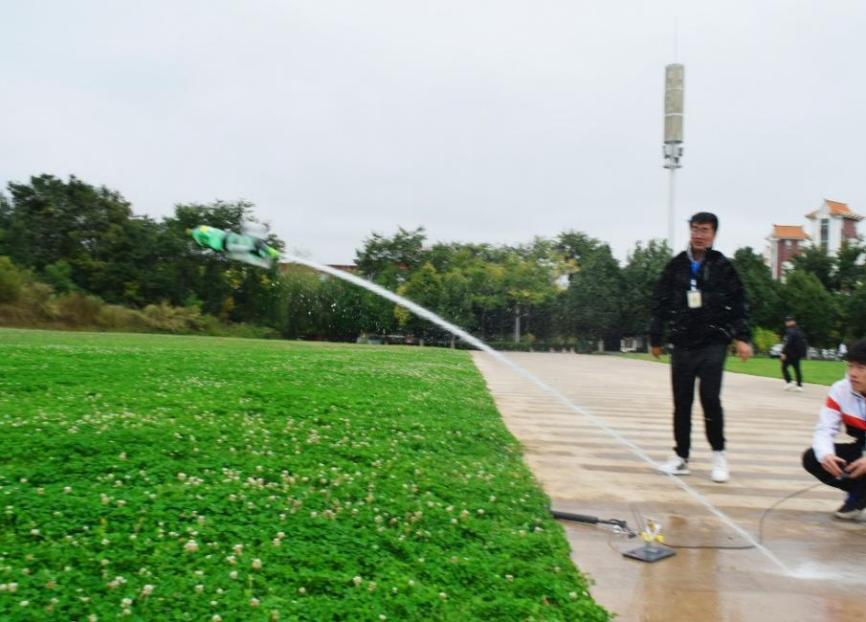 大赛在公教楼前草坪正式开始后,竞赛组的40余个参赛小组积极展示自己精心制作的水火箭,为争夺最远飞行距离展开激烈角逐。水火箭在压力的作用下飞出发射台,在空中留下一道道优美的飞行轨迹,赢得观众的阵阵喝彩,现场气氛十分热烈。美观组则以其精巧绝妙的设计,靓丽的色彩,精致的图案……令参与投票的观众赞叹不已。展示结束,工作人员和观众评选出竞赛组一、二、三等奖各一名(成绩分别为60.0米、54.9米、54.7米),优秀奖三名(成绩分别为47.5米、45.4米、43.7米),美观组优秀奖七名,并为他们颁发了奖杯和奖品。合力制作水火箭的过程加强了同学们的团队意识,也使彼此间的友谊更加深厚。