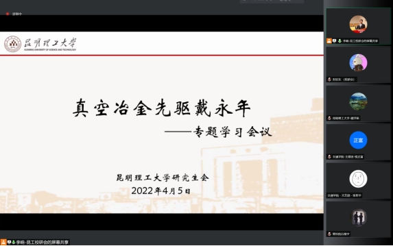 45日上午,冶能学院研究生会与校研究生会联合开展真空冶金先驱戴永年学习交流分享会,会议由校研究生会执行主席李响主持。