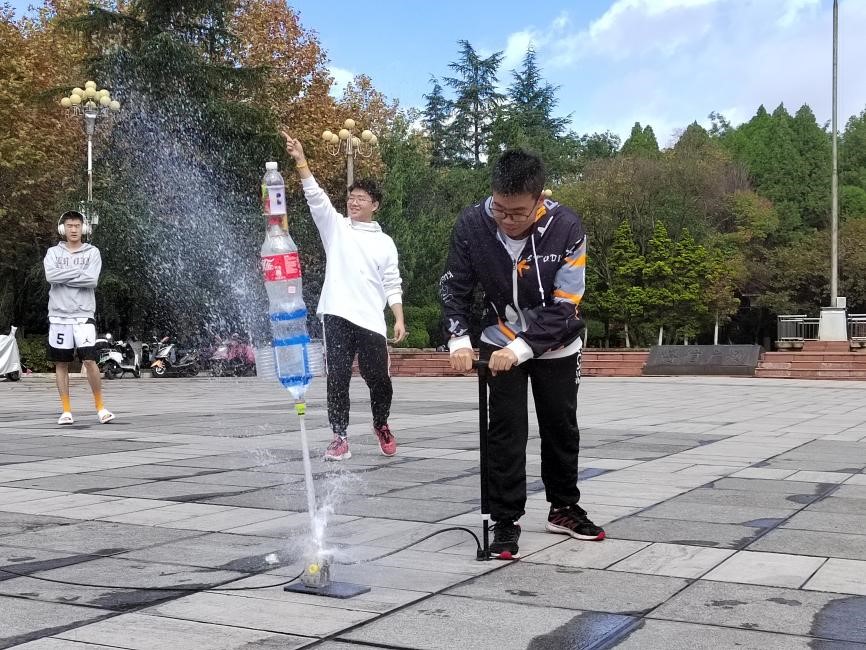 科技协会在莲华校区博信广场开展第六届“鎏行塑源”杯水火箭大赛。
