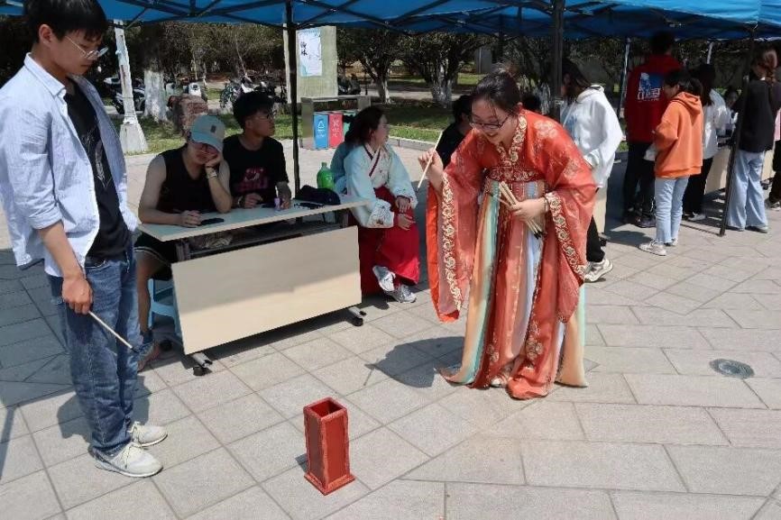 本次活动融合了文化、趣味、智力、体力等元素,包含投壶、猜谜、剪纸画、踢毽子、飞花令和汉服打卡六个主题,形式丰富多彩。同学身着华服,化作翩翩君子与佳人,活动现场妙趣横生,欢声笑语不断。