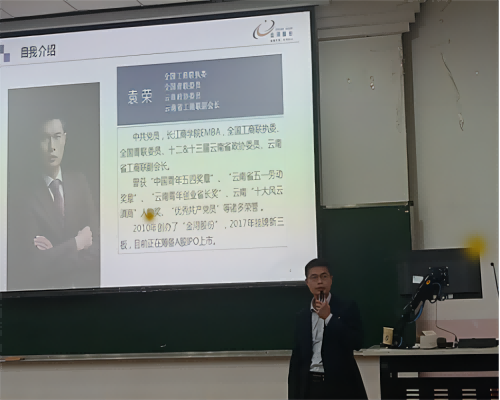 第27届中国五四青年奖章获得者、云南金浔资源股份有限公司董事长袁荣以“我的金浔梦”为主题进行宣讲。他以“浔梦”“筑梦”“追梦”为内容讲述了练就十八般武艺、创业报国的奋斗历程,鼓励大家“学什么专业做什么事”,坚定信念,坚持在熟悉的行业做到最优。宣讲现场气氛热烈,同学们认真听讲,踊跃提问,袁荣一一耐心解答。