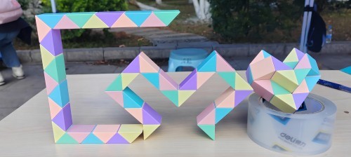 大赛分为魔方还原竞赛组和魔尺拼折美观组两个组别。活动现场,同学们选择自己感兴趣的项目展开角逐。魔方竞赛组的同学以最快的速度将魔方还原,力求用时最短。美观组的同学则用魔尺拧出的精美造型,工作人员为其拍照记录。现场气氛热烈,有的同学飞快转动手指,翻转魔方,展现出高超技术;有的同学奇思妙想,用魔尺构造出别致美观的造型,让人赞不绝口!