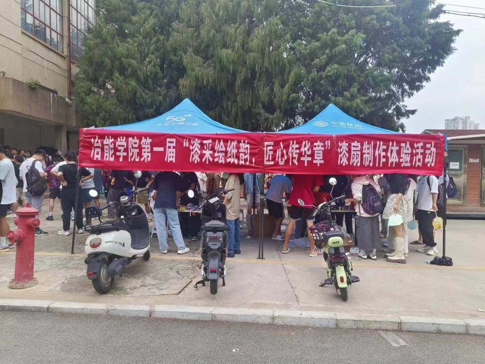 翰林社在莲华校区羽毛球馆旁空地举办“漆彩绘纸韵,匠心传华章”主题漆扇制作体验活动。本次活动面向冶能学院全体本科生,共计300余人参加。