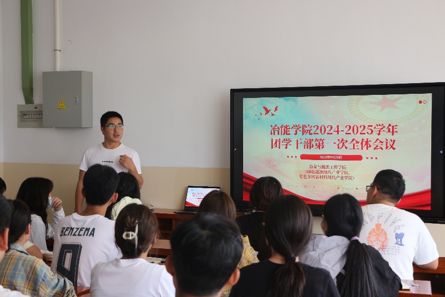 团委在莲华校区冶能楼418室召开2024-2025学年上学期第一次团学干部大会。2023级全体团学干部参加此次会议,会议由学院团委书记崔庆宇主持。