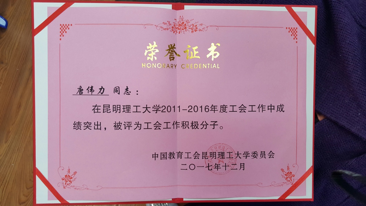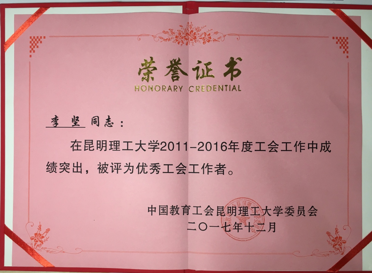 荣获2011-2016年工会工作先进集体(共有10个单位获奖)。李坚老师荣获优秀工会工作者(共有29人获奖)。唐伟力老师荣获工会积极分子(共有38人获奖)。樊刚老师荣获关心重视支持工会工作党政领导(共有28人获奖)。祝贺他们!祝贺学院!