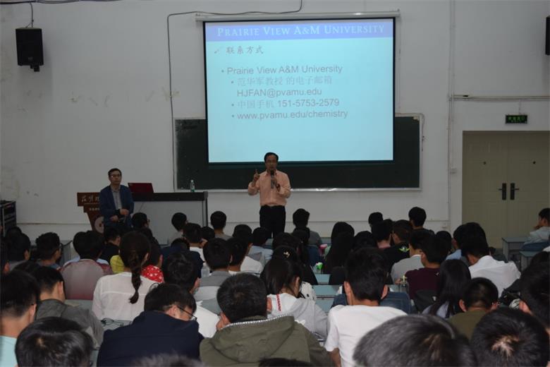 讲座上,范华军教授从如何提高学习效率、如何选择课题、如何做好科研方面入手,分享了他多年以来在美国的学习经历和教学经验,提出了“思路比解答问题更重要”的观点。范教授对美国普雷维农工大学的学校环境、师资团队、学术氛围等情况进行了介绍,展示了学校优秀的科研环境和治学严谨的导师,结合我校的情况,范教授指出国内外的导师有很多共同点,对学生一样严谨负责,愿意为学生提供学习条件和机会,鼓励大家从现在开始,打好基础、自我定位、敢于挑战、立志成才,机会就在身边,只要你是有心人就一定能成功。互动环节中,范教授就同学们提出的如何提高英语、出国留学会面对的问题等进行了耐心细致地回答了。