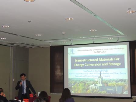 张久俊教授和孙学良教授分别作了题为“二氧化碳电化学还原产生低碳燃料:挑战与前景(Electrochemical Reduction of Carbon Dioxide to Produce Low-Carbon Fuels: Challenges and Perspectives)”和“能量存储与转换中的纳米材料进展(Development of Nanostructured Materials for Energy Conversion and Storage)”的学术报告。张教授详细介绍了二氧化碳电化学还原制备甲酸、甲烷、甲醇等低碳燃料的国内外研究进展及面临的挑战;孙教授系统的介绍了纳米材料在钠(锂)空气电池和磷酸铁锂电池等多个能源转换材料领域的研发及应用情况。报告中,师生们踊跃提问、相互探讨,互动交流,气氛活跃。