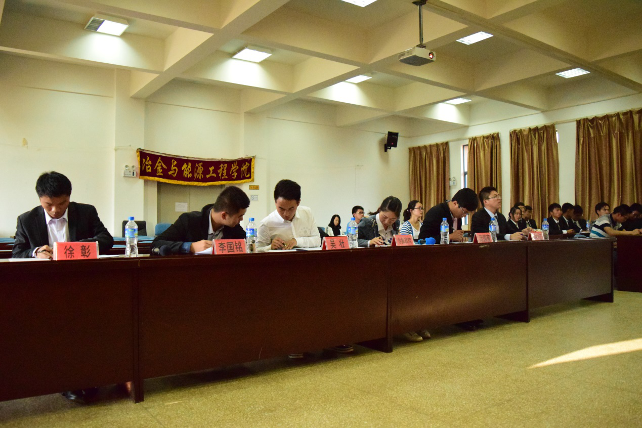 呈贡校区环工楼400报告厅举行了冶能学院2015级团委、学生会主席团换届第二轮竞选。此次竞选由冶能学院团委书记令狐欢欢老师、冶能学院2013级团委副书记吴壮同学和2014级团委、学生会主席团部分同学担任评委。