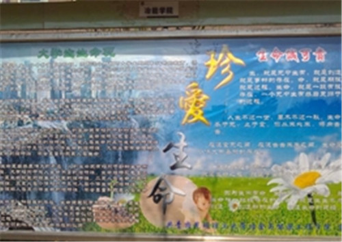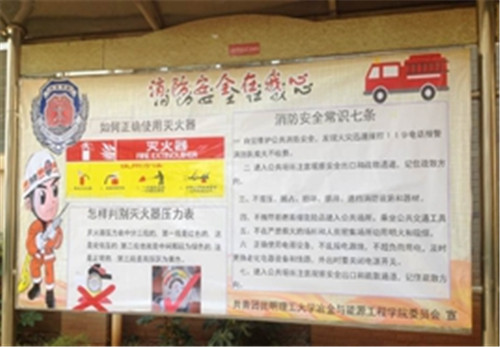 以消防安全、珍爱生命为主题更换了社区宣传栏和黑板报,在学生社区中形成了上下齐抓共管、人人关注、人人参与、群防群治的良好消防氛围。