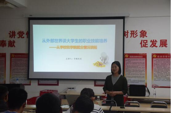 令狐欢欢副书记以“从外部世界谈大学生的职业技能培养”为主题,从冶能学院近几年的就业情况为依据向同学们讲解了作为当代大学生应当如何培养自己的职业技能。在讲座上,令狐副书记先从如何明确自我选择讲起,随后讲解了生涯规划的两个方向,并向同学们介绍了当今工作世界的宏观现状和就业情况,最后向大家详细讲解当代大学生应有的三个职业技能—专业的知识技能,可迁移技能和自我管理技能。