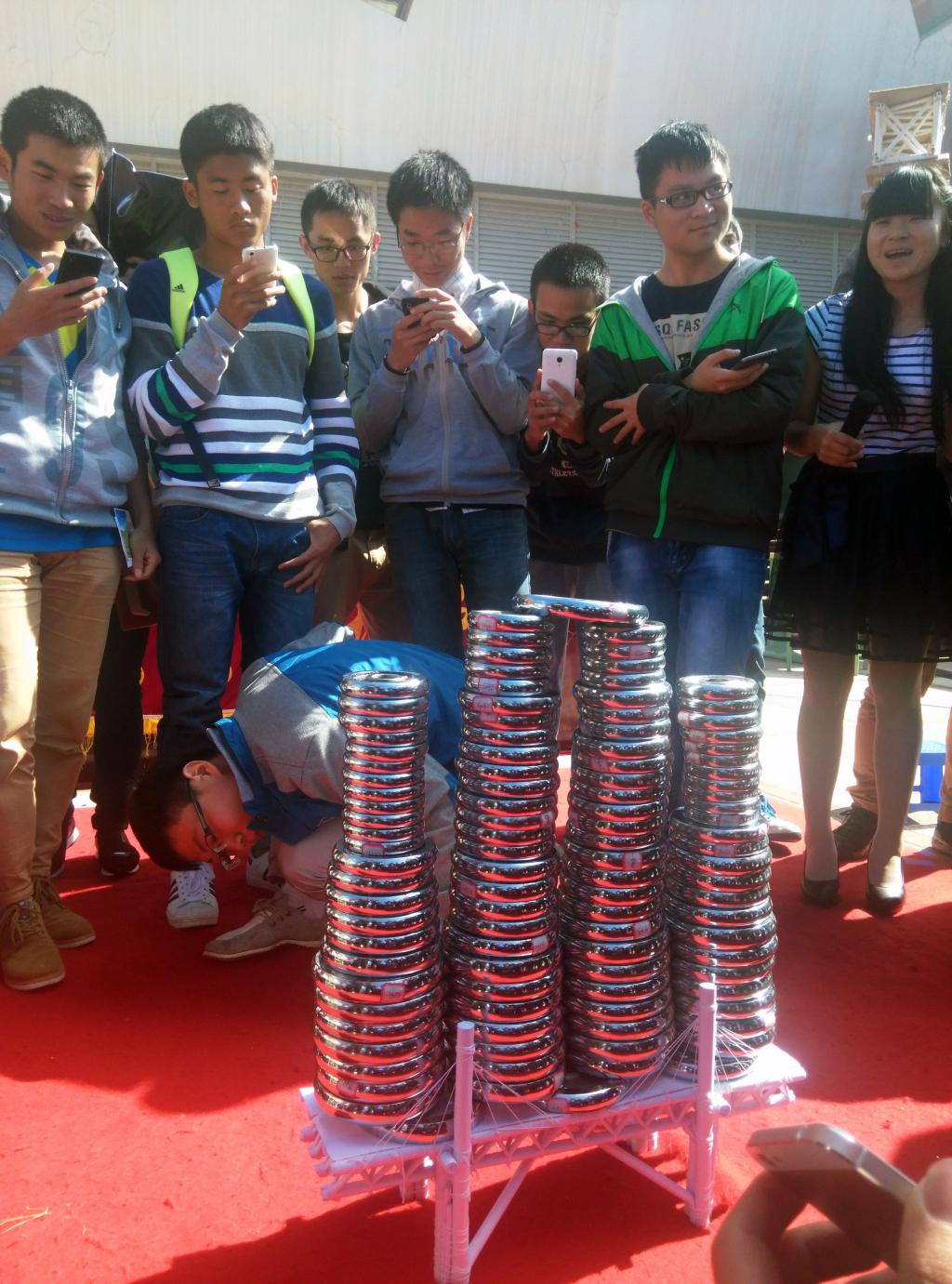 比赛在阵阵热烈的掌声中开始,大赛第一项先由承重组纸桥进行展示,参赛选手一一进行纸桥解说,并参展给到场观众。参赛选手凭借着自己幽默风趣的话语叙述了纸桥精细的结构,让比赛在凝重的氛围里透出轻松愉悦的气息。第二项则由美观组叙说创作灵感并且展示纸桥。选手独具匠心的创作,别出心裁的讲述,又一次带领观众欣赏走进一场视听盛宴。精妙绝伦的设计让每一个现场观众都啧啧赞叹,难以取舍。而看到自己的设计被认可的选手们,也由衷地感到开心。最让人期待的是承重组纸桥进行称重的时候,这也是此次比赛的高潮,选手们斟酌着属于自己的放码方式,看似小巧的纸桥,却承受了超出自身数十倍的重量。无论是以独特设计吸引观众的眼球,还是以称重数量获得嘉宾的惊叫,这都在设计者构思、完成纸桥工作的那一刻就注定了。