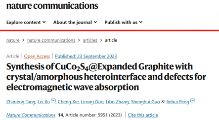 许磊教授在微波能吸收转化方面研究取得重要研究进展,相关成果以Synthesis of CuCo2S4@Expanded Graphite with crystal/amorphous heterointerface and defects for electromagnetic wave absorption为题,发表在学术期刊Nature communications上。
