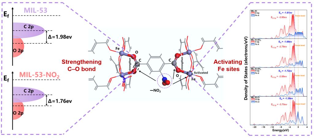 鉴于此,h动画 胡觉教授团队提出了一种配体工程策略,以解决MOF在电催化重构过程中关键的结构不稳定性问题。通过在MIL-53骨架中引入不同官能团(–NO2、–NH2、–Cl),阐明了–NO2基团对MOF骨架独特的稳定作用。性能评估表明,MIL-53-NO2在10 mA cm⁻2电流密度下具有227 mV的超低过电位,展现出相比商业IrO2(335 mV)显著的性能优势,同时即使在5000 mA cm⁻2的超高电流密度下仍能保持优异的电化学耐久性。DFT计算进一步揭示,–NO2的引入促进了C 2p与O 2p轨道之间的电子重叠,从而缩短了C–O键长并增强了键能,从而加固了MOF结构并防止其在动态OER过程中发生结构坍塌,这使得MOF骨架在OER过程中具有更高的结构完整性。本工作证实,配体工程策略能够通过稳定的C–O键实现可控的结构重构,同时活化Fe活性位点。这为设计高效且耐用的MOF基析氧电催化剂提供了一种通用、可推广的范式,从而解决了限制MOF催化剂在电催化能源转化中实际应用的一个关键瓶颈问题。